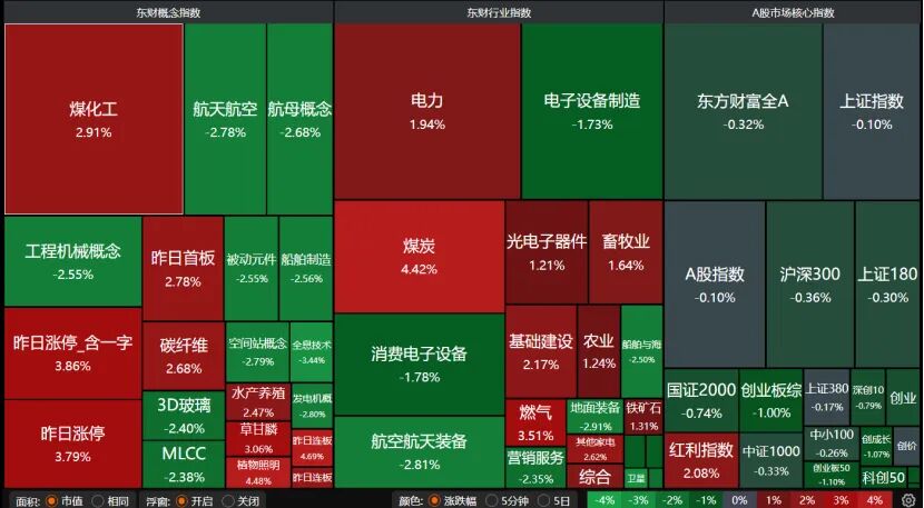 板块分化明显,煤炭、电力、光电子器件、基础建设、燃气等板块大涨,但工程机械概念、航天航空、被动元件、地面装备等板块大跌。