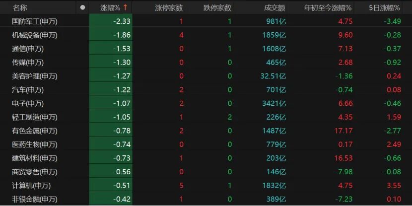 国防军工、机械设备、通信、电子板块领跌,传媒、美容护理、汽车、轻工制造等板块也表现不佳。