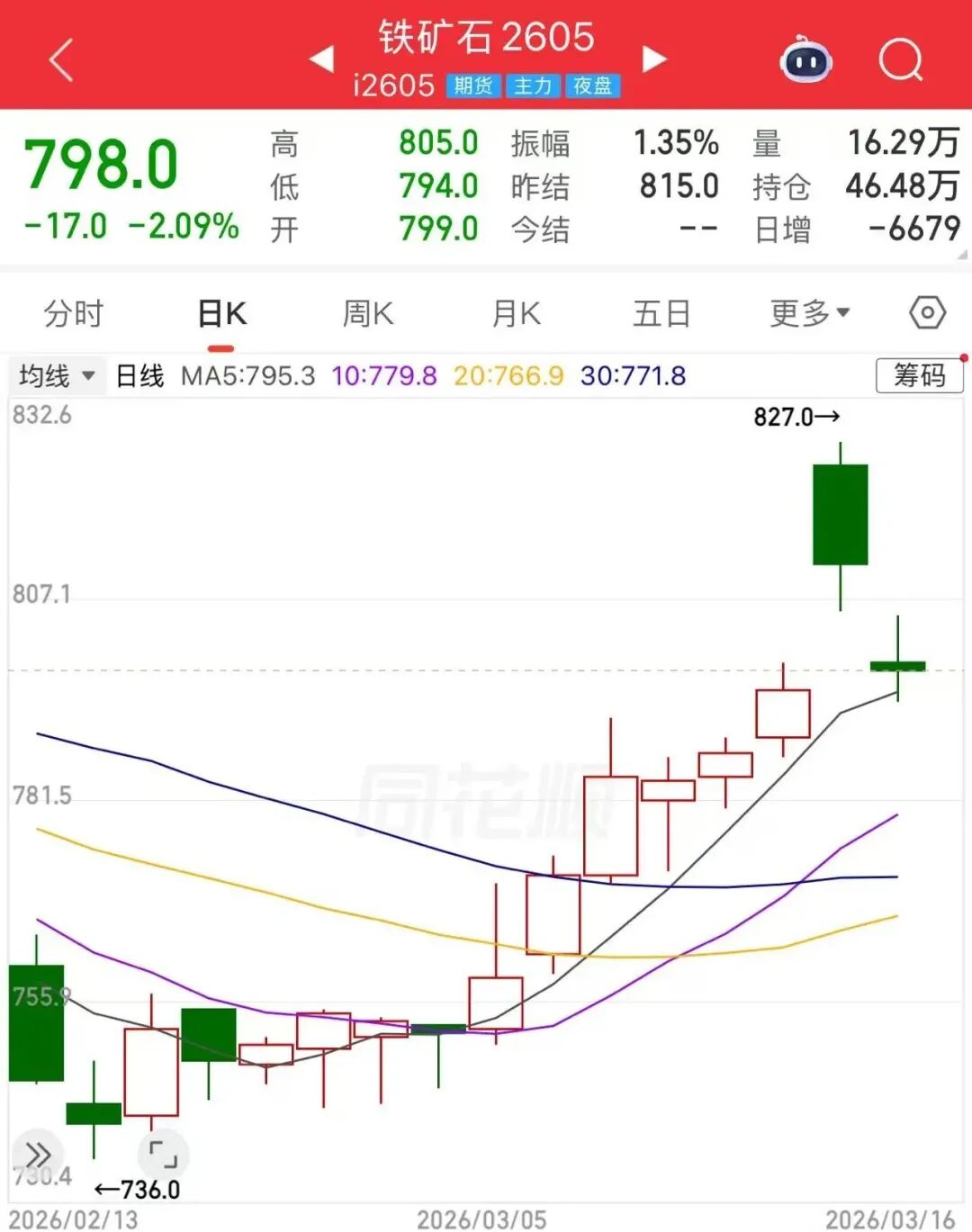 3月以来铁矿石价格持续上涨。3月13日,铁矿石期货主力合约收报811.5元/吨,较春节假期后的低点上涨75.5元/吨,涨幅为10.25%。3月12日,铁矿石普氏指数涨至109.10美元/吨,接近2025年的最高值109.50美元/吨。