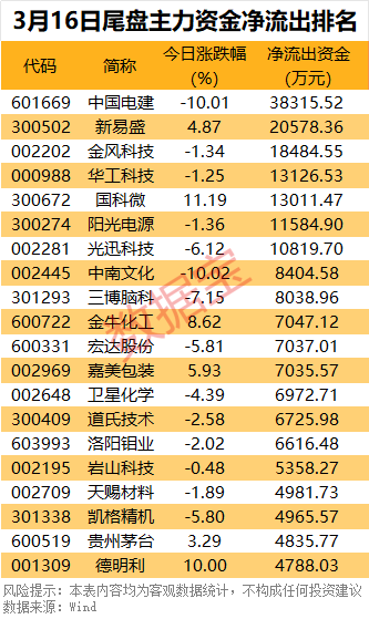27股尾盘主力资金净流出超4000万元,中国电建跌停,尾盘主力资金净流出3.83亿元;新易盛、金风科技、华工科技、国科微、阳光电源、光迅科技尾盘净流出均超1亿元。