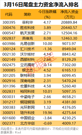 尾盘方面,14股主力资金净流入超5000万元,科技股资金流入较为集中,其中菲利华、胜宏科技、航天发展、英维克净流入资金均超1亿元。