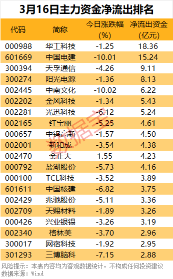 净流出方面,135只个股主力资金净流出超1亿元,17股净流出超3亿元。净流出个股主要集中在有色金属、基础化工等周期板块,以及部分前期涨幅较大的题材股。其中,华工科技、中国电建净流出资金超10亿元。