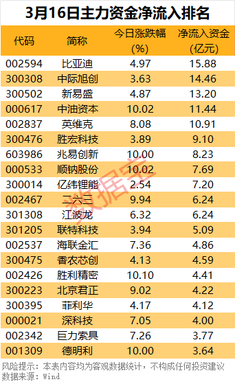 比亚迪以15.88亿元净流入额登顶,当日股价上涨4.97%;光通信板块龙头集体走强,中际旭创、新易盛分别以14.46亿元、13.20亿元净流入额紧随其后,股价分别上涨3.63%、4.87%。中油资本、英维克分别净流入11.44亿元、10.91亿元,其中中油资本股价涨停。