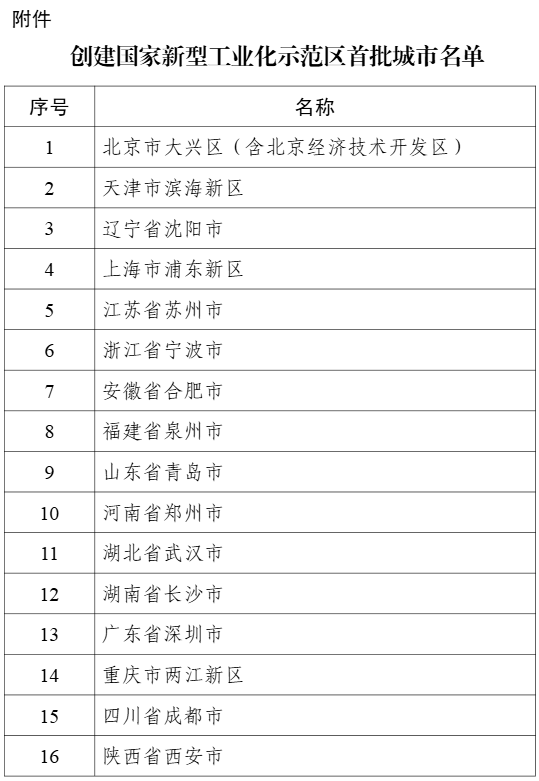 人民财讯3月16日电,工信部确定首批16个创建国家新型工业化示范区城市,现将名单予以公布。创建城市要对照创建期工作目标,优化创建工作方案,强化组织保障,完善政策措施,确保各项示范任务落实落细,在健全产业科技创新体系、推进产业结构优化升级、推动工业数字化智能化转型、加快工业绿色低碳发展、强化优质企业梯度培育、提升产业治理现代化水平等方面,形成一批具有示范性、引领性的重大成果,为推动新型工业化发挥引领辐射带动作用。