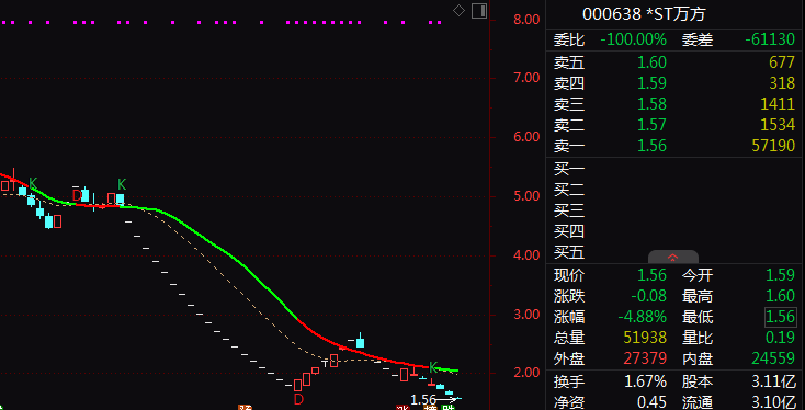 3月16日晚间*ST万方(000638)公告,发布关于公司股票存在可能因市值终止上市的首次风险提示公告,公司当日股票收盘价1.56元/股,总市值4.86亿元,首次触及总市值低于5亿元的退市红线,公司股票面临多重退市风险叠加的局面。