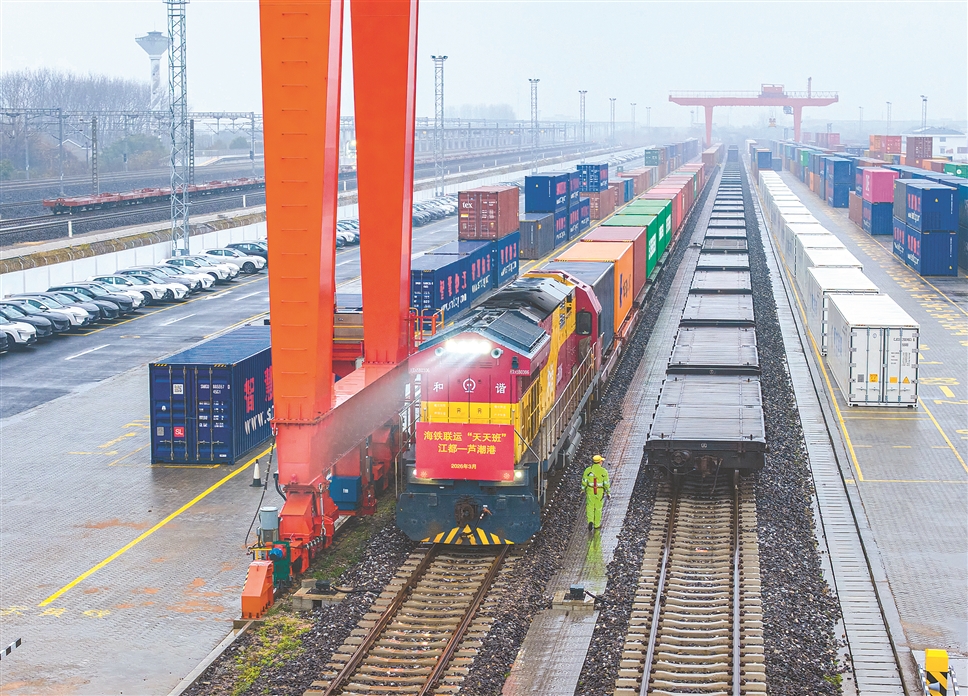 3月16日下午,一趟载有光伏组件、汽车配件、日用品等货物的集装箱班列从南京铁路物流中心江都物流基地始发,约12小时抵达上海芦潮港后转航运发往欧洲,标志着江都——芦潮港海铁联运“天天班”专列正式开行。新华社发 任飞/摄
