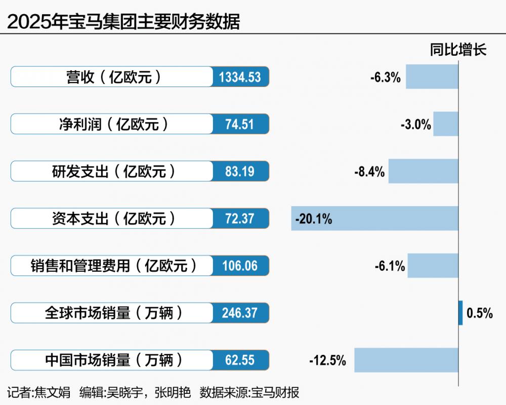 在全球销量稳住的同时,宝马的营收和利润却在下滑。2025年总营收1334.53亿欧元,同比下降6.3%;税前利润102.36亿欧元,同比下降6.7%;净利润74.51亿欧元,同比下降3.0%。