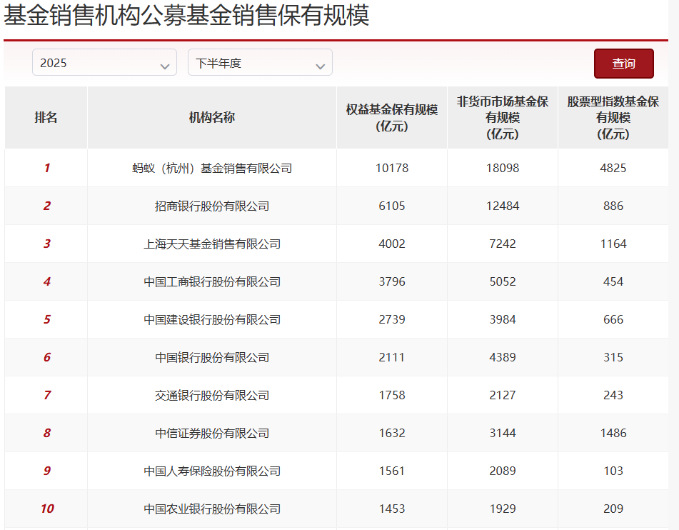 最新一期公募基金销售保有规模百强榜单出炉,行业呈现银行、券商、第三方机构各具特色的格局。蚂蚁基金依旧占据绝对优势;招商银行稳居银行渠道标杆;券商则在股票型指数基金代销上更为“卖力”。