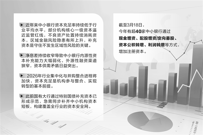 广发证券银行业首席分析师倪军接受证券时报记者采访时表示,这是四方面因素叠加的必然选择:第一,近年来中小银行资本充足率持续低于行业平均水平,部分机构核心一级资本逼近监管红线,不良资产处置持续消耗资本,区域金融风险隐患有所上升,补充资本是守住不发生区域性风险的关键;第二,净息差持续收窄导致中小银行内源性资本补充能力大幅弱化,外源性融资渠道狭窄,资本供需矛盾日益突出;第三,2026年行业集中化与并购整合进程将加快,资本充足是机构参与整合、实现转型的基本前提;第四,此前国有大行通过特别国债补充资本已形成示范,急需同步补齐中小机构资本短板,构建覆盖全行业的资本安全网,因此监管重新将中小机构资本补充置于重要政策位置。