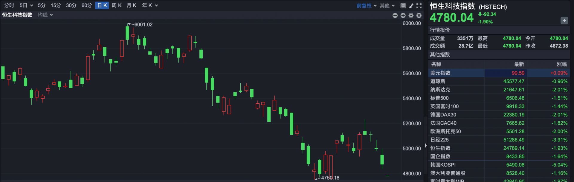 恒生科技指数开盘报4780.04点,下跌92.34点,跌幅1.90%。