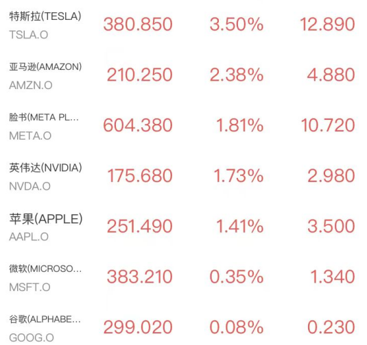 明星科技股全线走高,特斯拉涨3.5%,亚马逊涨超2%,Meta、英伟达和苹果涨超1%。