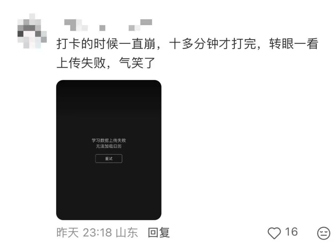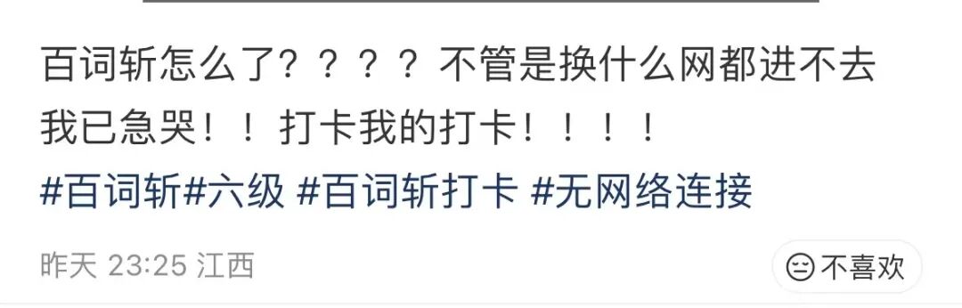 3月23日晚,有不少网友在社交平台发文称,背百词斩莫名出现“网络错误”“学习数据上传失败无法加载日历”等提示,为此,有网友蹲在路由器旁不停刷新,可依然无法正常进行学习打卡,“重启手机,重连网络,把百词斩卸载了又重新安装,都没有用。”甚至有网友称:“连续打卡几百天了,打不了卡急哭了。”