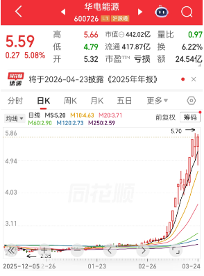 人民财讯3月24日电,3月24日,华电能源(600726)股价大幅波动,该股盘中一度跌停,午后股价大幅拉升并翻红,收盘涨幅5.08%,最新收盘价创近9年来新高。证券时报·数据宝统计,自2026年2月26日以来,该股连续收获多根阳线,目前日K线已录得19连阳,成为近3年来连阳天数最高的股票。日K线连阳期间,华电能源股价累计涨幅111.74%。