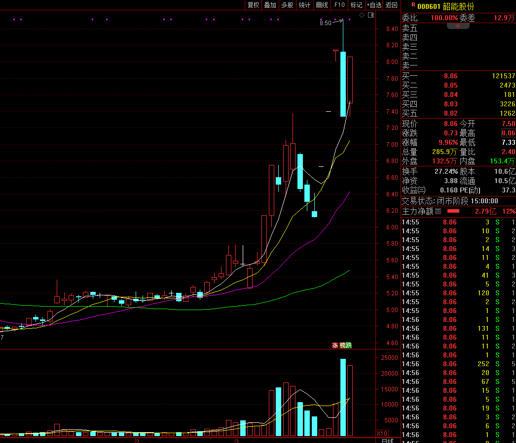 人民财讯3月24日电,绿电概念股韶能股份昨天跌停,今天涨停。韶能股份今日成交22.5亿元,盘后龙虎榜数据显示,多个活跃游资营业部买入,其中,国泰海通证券武汉紫阳东路证券营业部买入1.08亿元,卖出6万元;国泰海通证券上海浦东新区海阳西路证券营业部买入7601万元,卖出398万元;国泰海通证券上海长宁区江苏路证券营业部买入5587万元,卖出164万元;国泰海通证券南京太平南路证券营业部买入4237万元,卖出45万元。卖出方面,深股通专用卖出1.30亿元,买入1.13亿元。(提示:仅为分享信息,不构成投资建议。)
