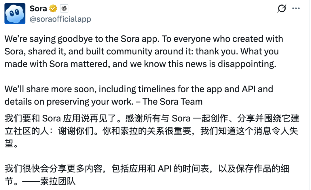 北京时间3月25日,Sora在社交平台发文称:“我们即将停用Sora应用。向每一位曾用Sora进行创作、分享,并围绕它建立社区的朋友表示:由衷感谢你们。我们也深知这个消息令人失望。我们将尽快公布更多信息,包括应用与API的下线时间安排,以及如何保留大家作品的详细方案。”而OpenAI CEO山姆·奥尔特曼还在忙着宣传新模型、强调模型性能,尝试稳固外界对OpenAI的信任。