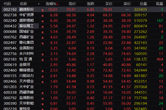 其他锂矿概念股中,中矿资源、盛新锂能涨幅超过6%,富临精工、国城矿业涨幅超过5%。