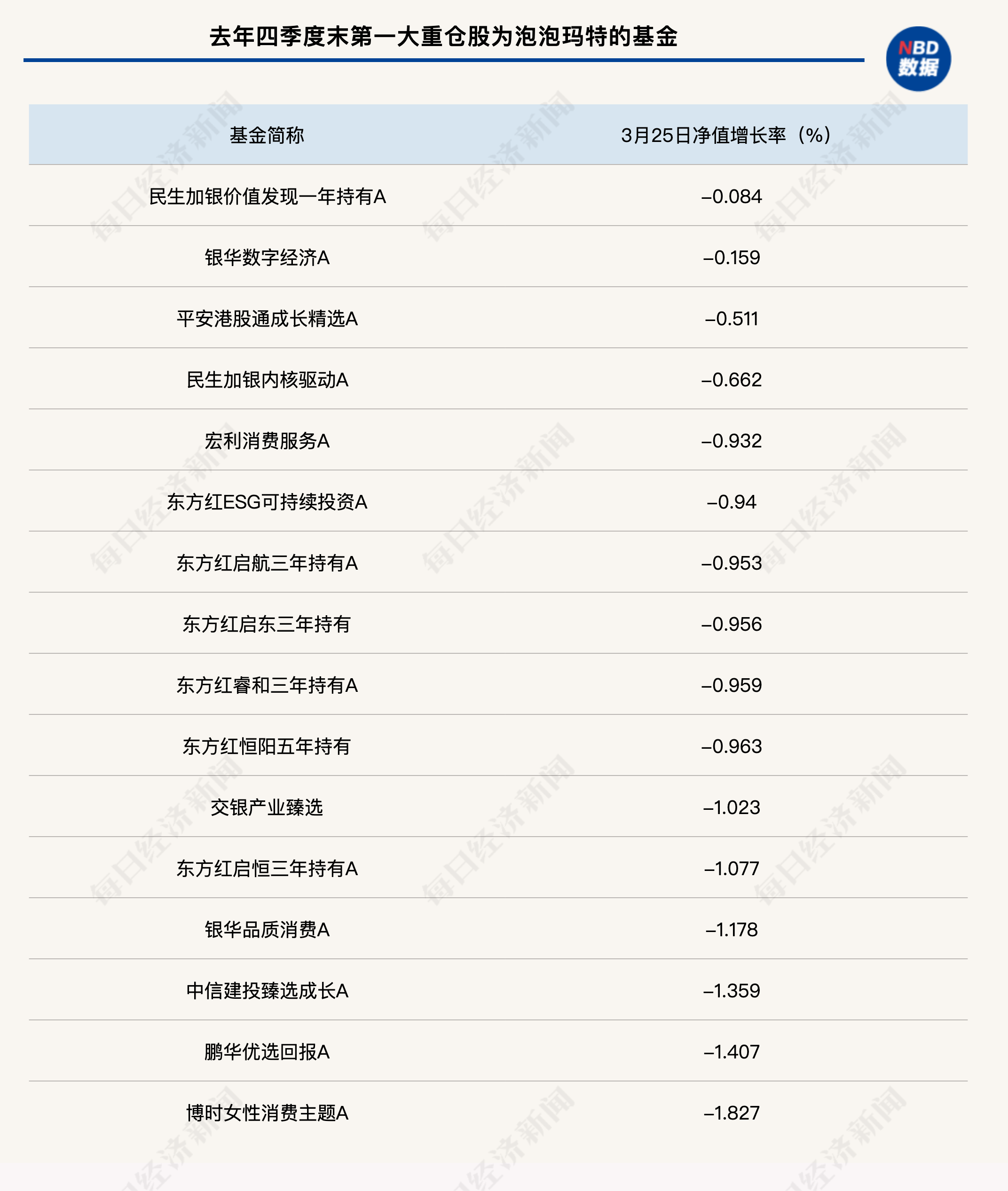 无独有偶,银华数字经济也是去年四季度末重仓泡泡玛特的产品,季末市值同样位居第一大重仓股,基金A类份额昨日跌幅仅为0.16%。记者注意到,在去年四季度末将泡泡玛特列为第一大重仓股的主动型基金中,3月25日的净值跌幅最大仅1.83%。