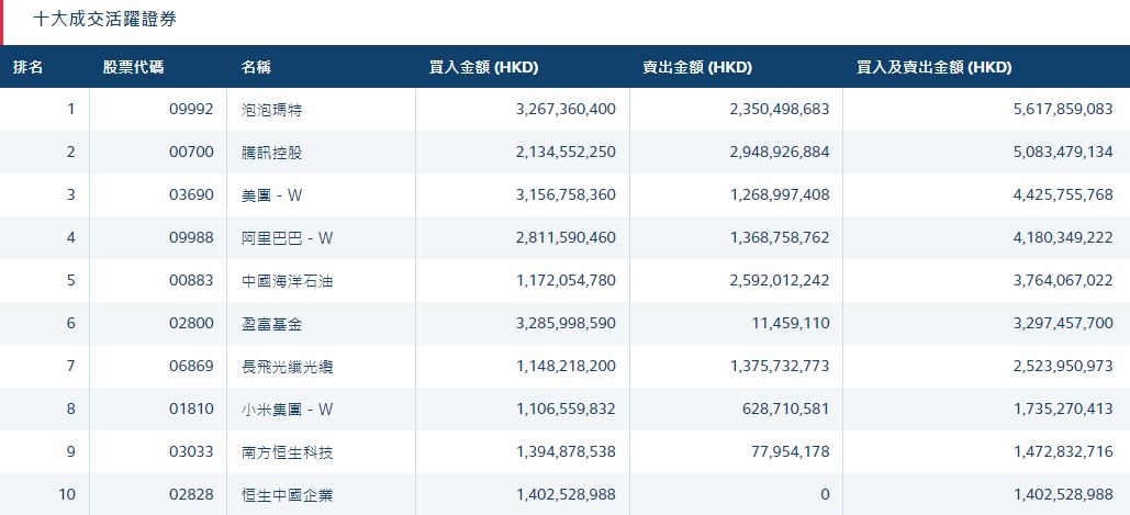深港通3月25日前十大活跃证券,统计来源:港交所