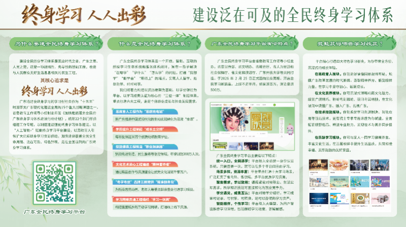 广东全民终身学习平台由省委教育工作领导小组主办,省委宣传部、省文明办、省教育厅、省人力资源和社会保障厅、省文化和旅游厅、广东开放大学等共同打造,于2026年2月25日正式面向公众亮相,开启了全民学习的新篇章。