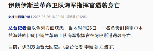 另据央视新闻,该指挥官负责封锁霍尔木兹海峡,在阿巴斯港遇袭身亡。目前,伊朗方面暂无回应。