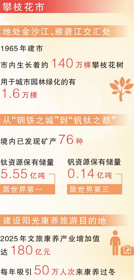 “火红的攀枝花,陪伴着我们探索资源型城市的转型发展之路。”攀枝花市文化广播电视和旅游局产业科科长马文超说,通过做好“康养+”融合文章,推广“暖暖花城·慢慢生活”等文旅品牌,康养产业建圈强链取得良好成效。攀枝花连续6年跻身中国康养可持续发展20强市,每年吸引50万人次来康养过冬,2025年文旅康养产业增加值达180亿元。