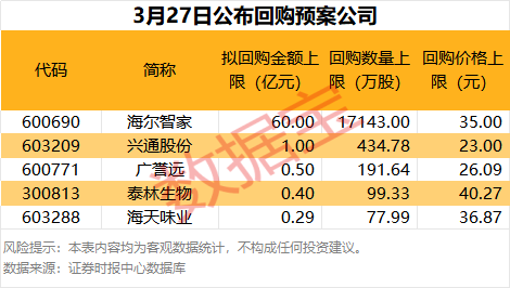 3月27日共有5家公司发布公告,拟进行股份回购,合计回购金额上限为62.19亿元。