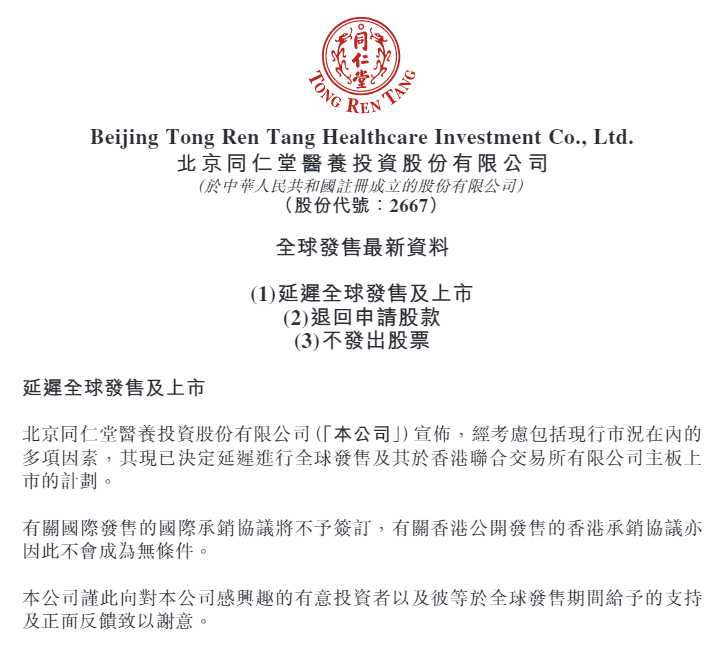 3月27日,即将结束招股并计划在3月30日上市的港股新股同仁堂医养突然发布公告称,经考虑包括现行市况在内的多项因素,决定延迟进行全球发售及其于香港联合交易所有限公司主板上市的计划。