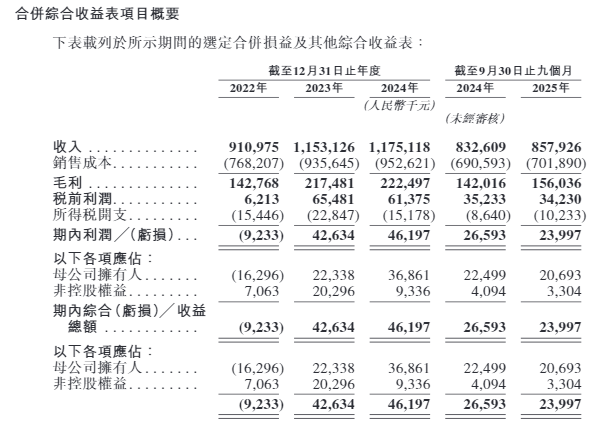 招股书显示,在2022年、2023年、2024年以及2025年前9个月,同仁堂医养收入分别为9.11亿元、11.53亿元、11.75亿元和8.58亿元,利润分别约为-923万元、4263万元、4620万元和2400万元。