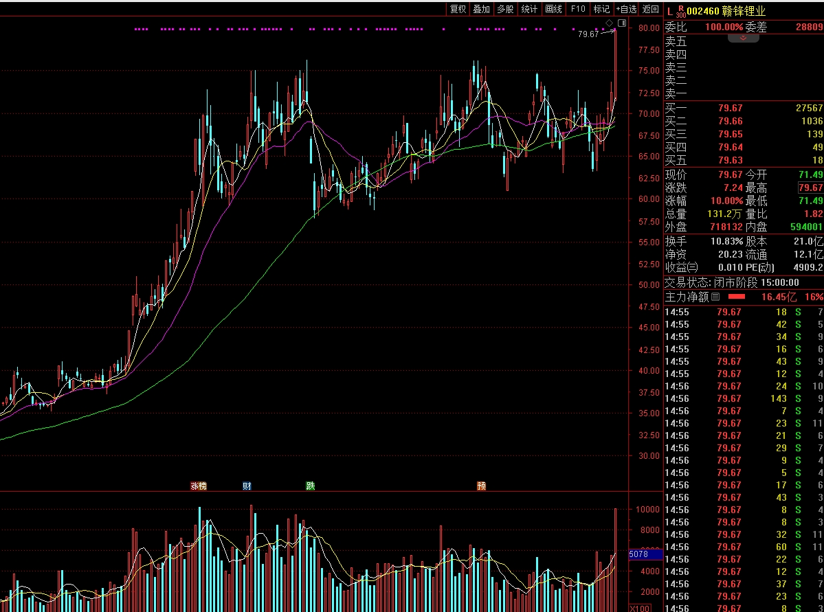 人民财讯3月27日电,锂电池概念股今日大涨,赣锋锂业等涨停。赣锋锂业成交金额100亿元,盘后龙虎榜数据显示,活跃游资国泰海通证券武汉紫阳东路证券营业部买入2.76亿元,卖出136万元。该营业部当日还买入2.07亿元东方新能,卖出10万元。