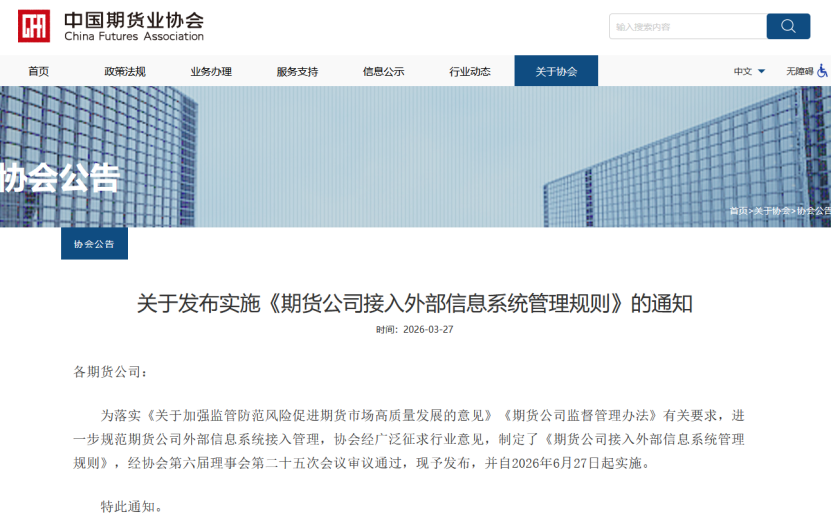 3月27日,中国期货业协会(下称中期协)正式发布《期货公司接入外部信息系统管理规则》(下称《管理规则》),新规将于6月27日起实施。