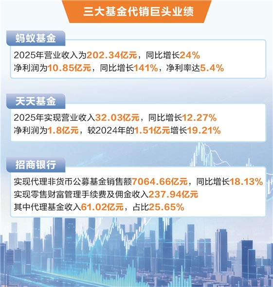 最新公告显示,2025年,蚂蚁基金全年净利润突破10亿元大关,其权益基金保有规模更是在业内首破万亿元大关;天天基金则在经历三年调整后业绩强势反转,基金销售额创下历史新高;另一巨头招商银行也凭借“长盈计划”圈粉千万,代理基金收入大增。