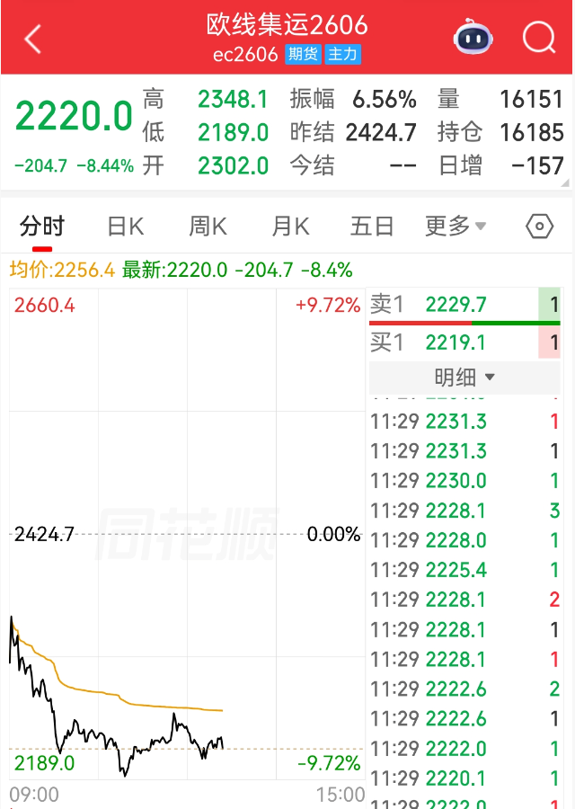 受中东局势缓和影响,4月1日,集运指数(欧线)期货开盘后显著下行,主力2606合约一度跌超9%,盘中最低触及2189点。