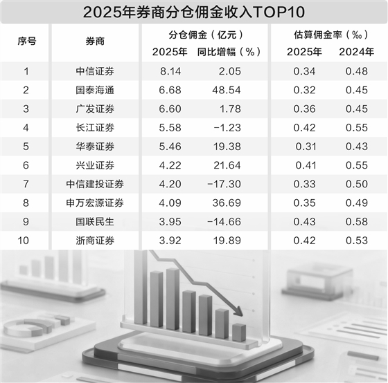 头部排位因券商合并重组出现变化。2025年分仓佣金收入前5名分别为中信证券、国泰海通、广发证券、长江证券和华泰证券。其中,中信证券以8.14亿元继续领跑,同比微增2.05%。