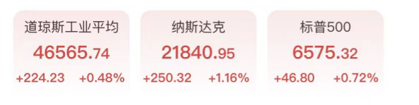 美股周三全线上涨,科技股大幅走强,市场关注中东冲突结束前景。截至收盘,道琼斯工业平均指数上涨224.23点,涨幅0.48%,收于46565.74点,纳斯达克综合指数上涨1.16%,收于21840.95点,标普500指数上涨0.72%,收于6575.32点。
