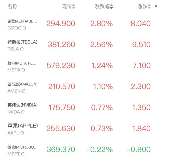 明星科技股普涨,谷歌涨2.80%,特斯拉涨2.56%,Meta和亚马逊涨超1%,仅微软跌0.22%。