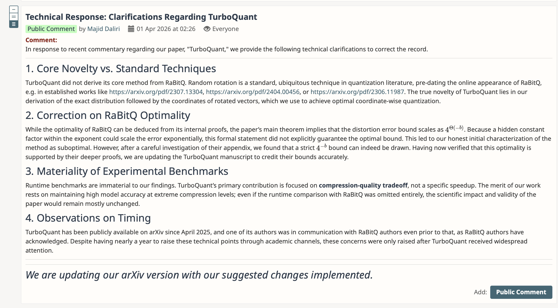 “然而我也明确指出,RaBitQ和TurboQuant都使用随机旋转,并要求TurboQuant的作者比较TurboQuant和RaBitQ之间的设计差异如何影响性能。”这位审稿人表示,正确的学术实践是在论文中深入讨论RaBitQ和TurboQuant之间的差异,但审稿时“惊讶地发现RaBitQ在主论文的实验部分只提到过一次”。
