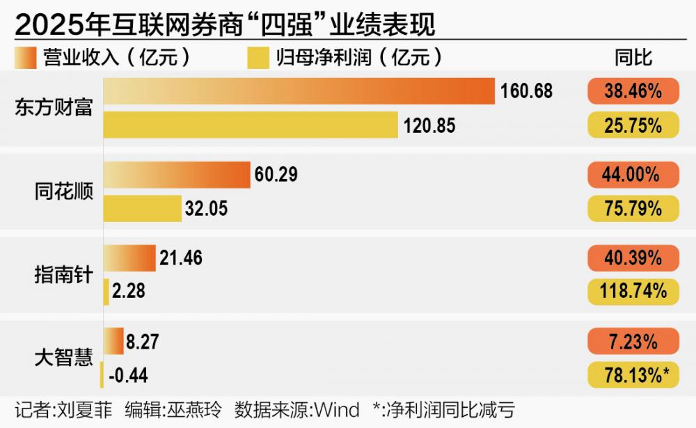 随着2025年年报的陆续披露,互联网券商“四强”:东方财富、同花顺、大智慧、指南针的最新“战绩”悉数亮相。