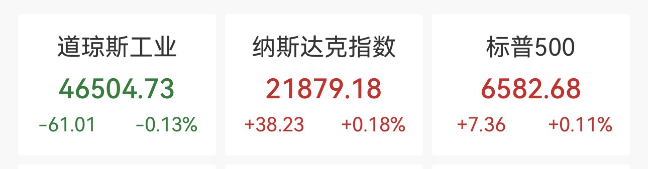 截至收盘,道琼斯工业平均指数跌61.07点,跌幅0.13%,收于46504.67点。纳指涨38.23点,涨幅0.18%,收于21879.18点。标普500指数涨7.37点,涨幅0.11%,收于6582.69点。