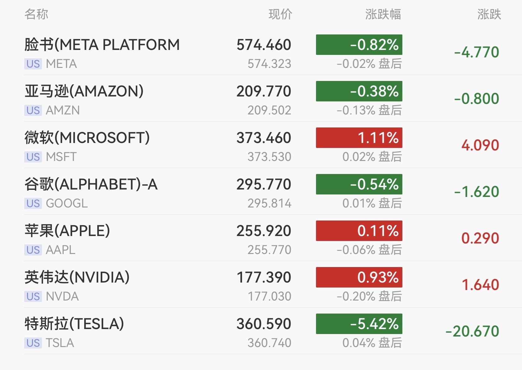 明星科技股涨跌互现,微软收涨1.11%,英伟达涨0.93%,苹果涨0.11%,Meta跌0.82%,谷歌跌0.54%,亚马逊跌0.38%。