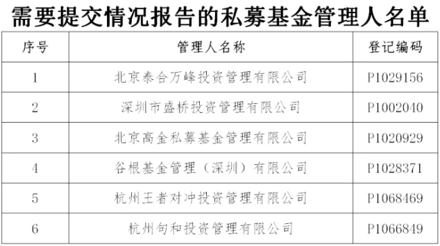人民财讯4月3日电,中国证券投资基金业协会(简称“中基协”)公告,近期,通过资产管理业务综合报送平台(简称“AMBERS系统”)中登记的电话、电子邮件、短信等形式,无法与北京泰合万峰投资管理有限公司等6家私募基金管理人取得有效联系。