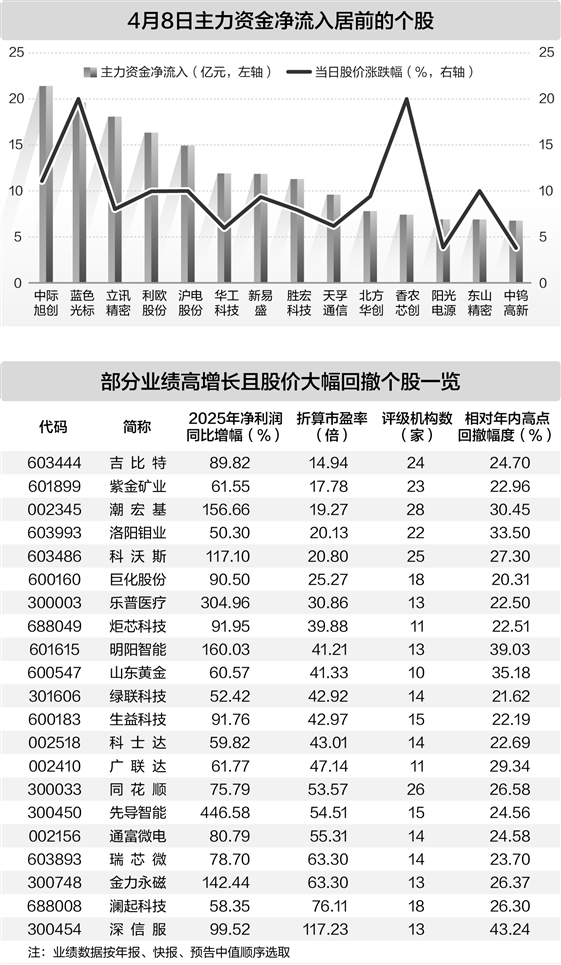 从个股来看,有190股获主力资金净流入超1亿元,其中8股净流入金额超10亿元,中际旭创净流入21.41亿元居首。