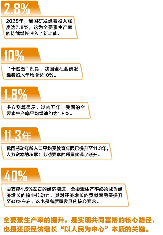 在传统要素驱动边际效应递减的背景下,全要素生产率,即要素投入转化为产出的总体效率,已成为影响中国经济潜在增速的核心变量。提升全要素生产率,归根结底要靠科技创新与制度改革的协同发力。2025年,我国研发经费投入强度达2.8%,首次超过经济合作与发展组织(OECD)国家平均水平,这为全要素生产率的持续增长注入了新动能。