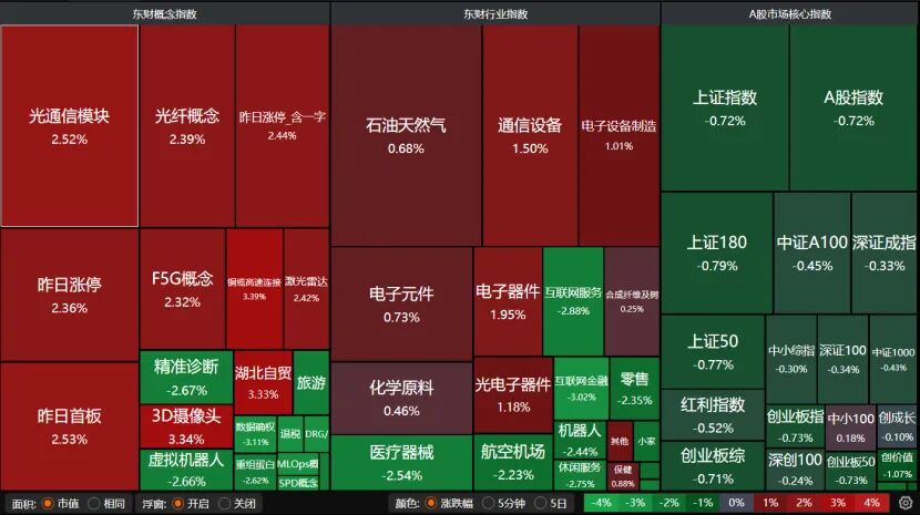 盘面上,光通信模块领涨,石油天然气、电子元件、电子设备制造收红,但虚拟机器人、重组蛋白、医疗器械、航空机场、休闲服务、零售跌幅靠前。