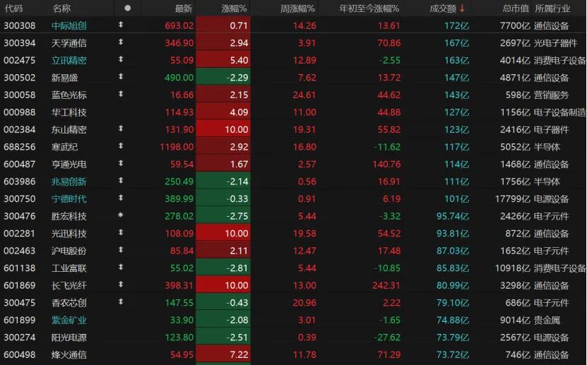 仅有1140只个股收红,涨停股61只;4299只个股收跌,跌停股13只。11只个股日成交额超过100亿元,中际旭创、天孚通信均收涨,但新易盛跌逾2%。华工科技涨逾4%,寒武纪、亨通光电也表现不错。