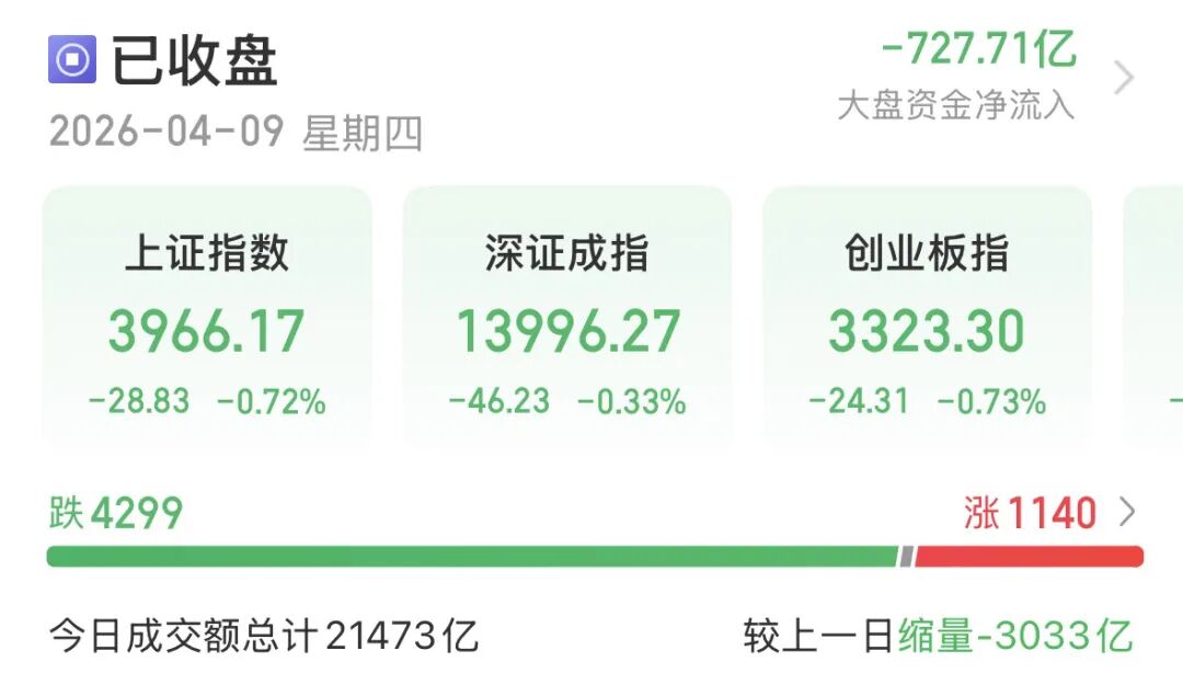 美伊冲突缓和再生变数,4月9日,A股低开低走,成交额缩至2.15万亿元,近4300只个股收跌,大消费板块领跌。