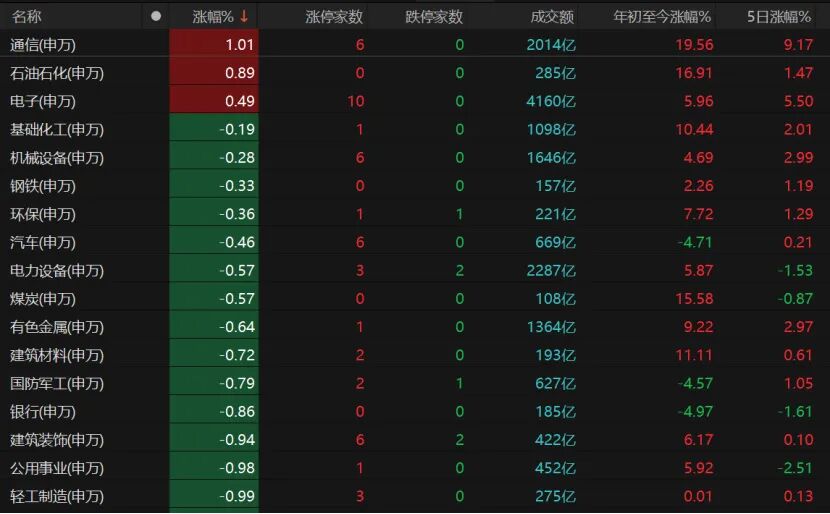 31个申万一级行业中,通信、石油石化、电子收红,中嘉博创、特发信息、光迅科技、长飞光纤、长江通信等6只通信个股涨停,军工等科技股微调。