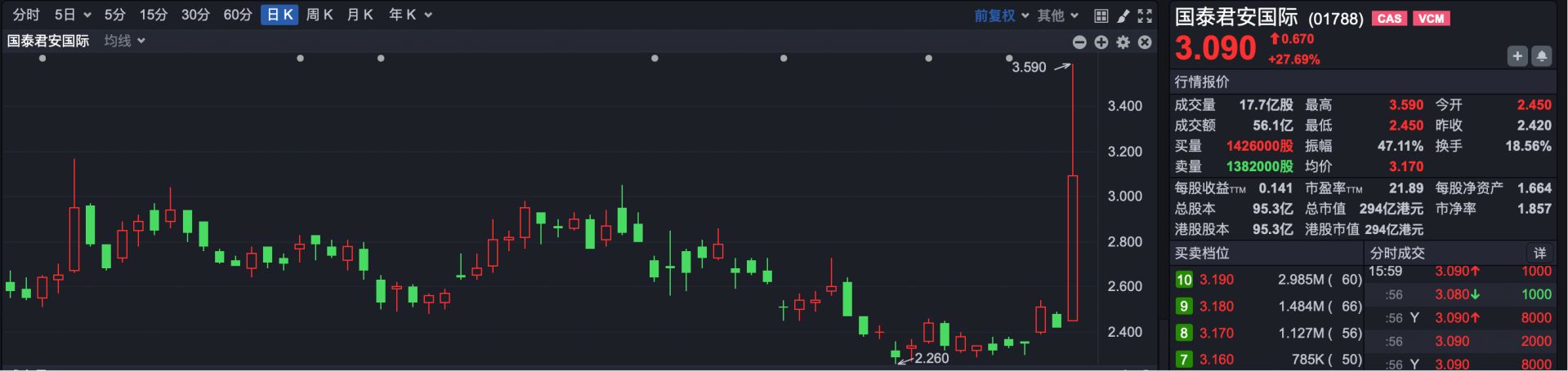 此外,国泰君安国际(HK01788)一度涨超48%,收盘上涨27%;申万宏源香港涨超18%。