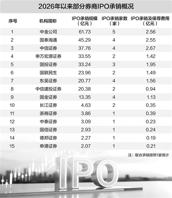 在承销及保荐收入方面,中信证券以2.67亿元拔得头筹,中金公司(2.56亿元)与国泰海通(2.55亿元)分列二、三位,三者合计占据年内券商IPO承销保荐收入逾四成。
