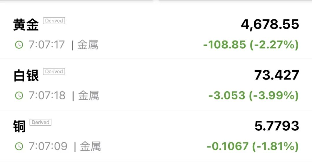 贵金属方面,现货黄金、现货白银开盘跳水。截至发稿,现货黄金跌2.27%,报4678.55美元/盎司。现货白银跌近4%报73.427美元/盎司。