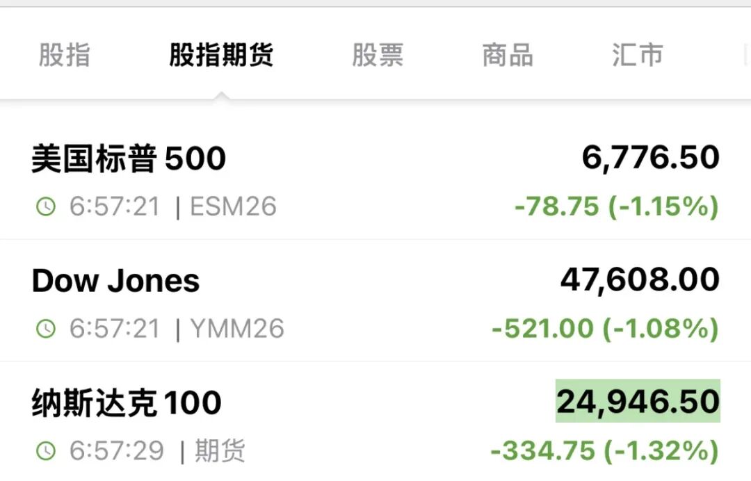 美股三大指数期货集体下挫,截至发稿,均跌超1%。